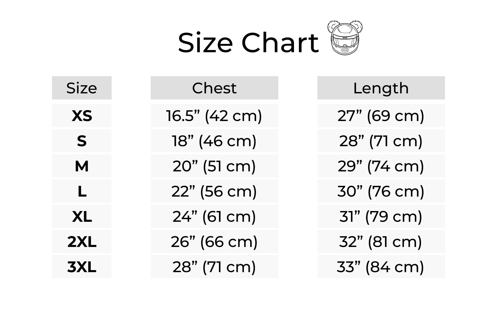 Below is a sizing chart for our t-shirts, providing measurements in inches and cm for the chest and length. Please refer to this chart to find the best fit for you.